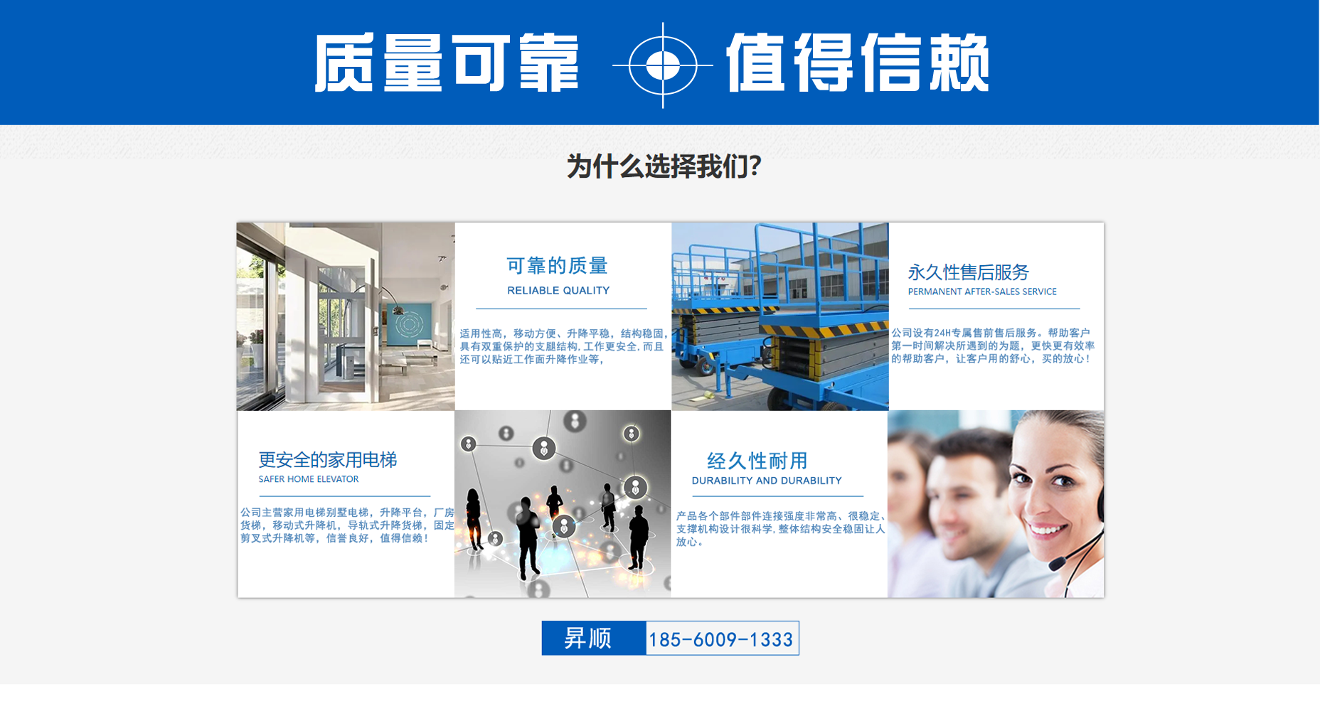 山東昇順液壓升降機械有限公司是一家主營家用電梯,別墅電梯,升降平臺,廠房貨梯,移動式升降機,導軌式升降貨梯,固定剪叉式升降機等產品企業,質量可靠,值得信賴?! ∮脩糁辽?,以用戶為中心”是公司永遠堅持的服務宗旨,贏得用戶的贊許是我們的榮譽,及時滿足用戶的需求,是我們公司的愿望。長期以來,公司員工以優質的服務,取悅于用戶,以誠信的言行取信于用戶,得到了用戶們的好評。我們期待著與您更加愉快的合作!公司的發展,離不開社會的大力支持,在社會的支持和幫助下,我們正昂首闊步邁向未來! 我們的經營方針是:以質量求生存,以產品求發展,以信譽保合作,以服務贏客戶?! ”竟緦Ξa品質量和各項服務恪守合同承諾,并愿與新老客戶精誠合作,共創未來?! 」揪瘢簞撔率侵黝},超越是不懈的追求。 公司宗旨:信譽保證,誠信為本?! ∥覀儠院侠淼膬r格,良好的信譽,雄厚的實力,優質的產品,最周到的服務,服務于廣大新老客戶!...